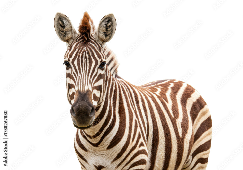 Striking zebra portrait isolated on transparent background, captivating animal with unique stripes in PNG format for design projects