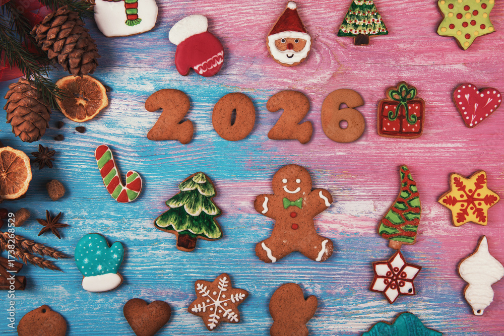 Festive gingerbread cookies with icing decorations and the number 2026 arranged on a colorful wooden background with holiday accents.