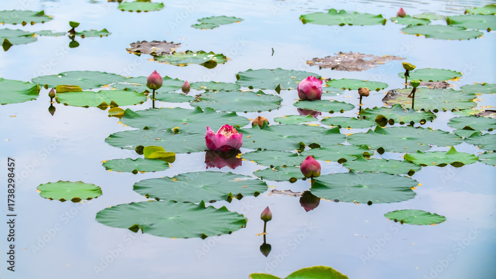 Lotus pond. Water lily close up. Sacred lotus flower in Buddhism. Calmness and tranquility. Spa treatments, yoga, meditation. Tropical nature.