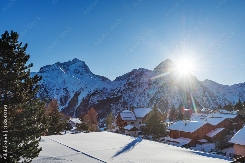 Village chalets glow under rising sun on snowy alpine slope