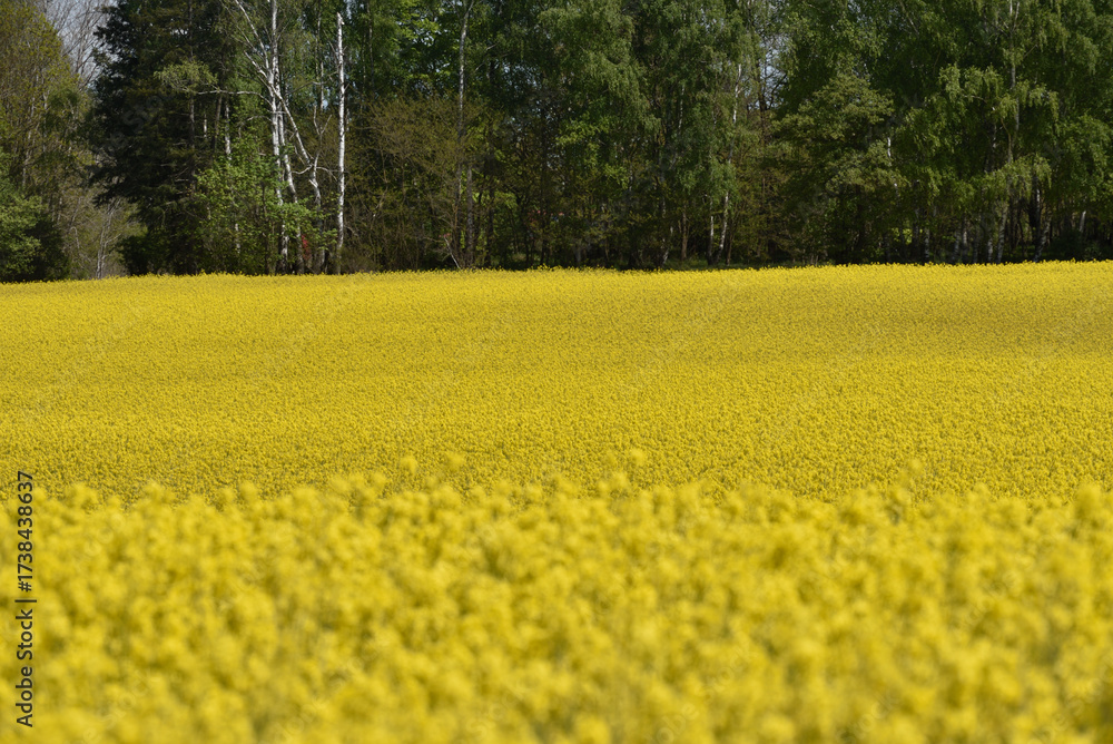 A vibrant yellow rapeseed field stretches toward a lush green forest under a partly cloudy sky, capturing the beauty of rural summer scenery.