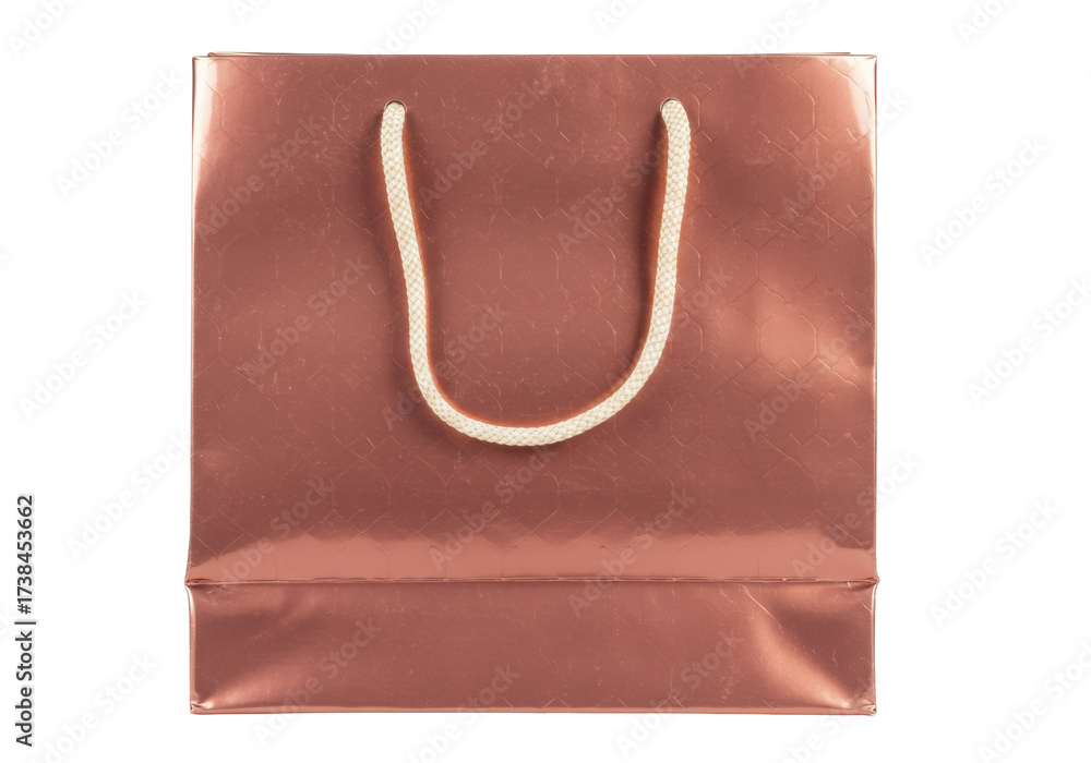 Rose gold gift bag isolated on white, shiny metallic paper shopping bag for presents and party favors