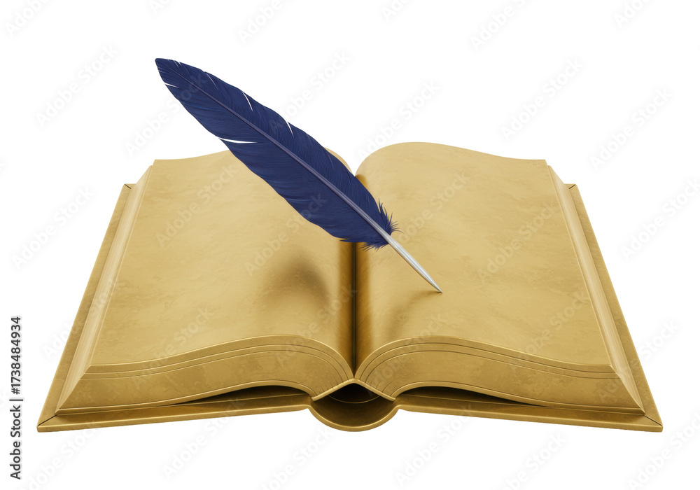 Open golden book with blue quill pen isolated on transparent background, antique writing instrument for education and literature