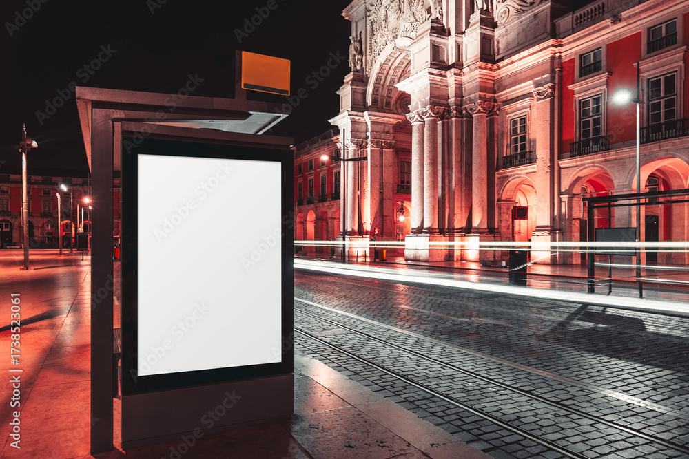 Night cityscape featuring a blank vertical billboard mock-up at a modern bus stop with street lights, motion blur of passing traffic, and illuminated historic architecture in downtown Lisbon, Portugal