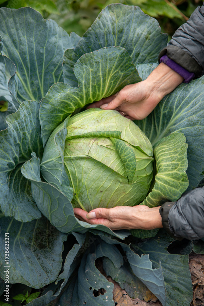 Large cabbage head growing in the vegetable garden, close up with hands. Planting green organic food for healthy diet.