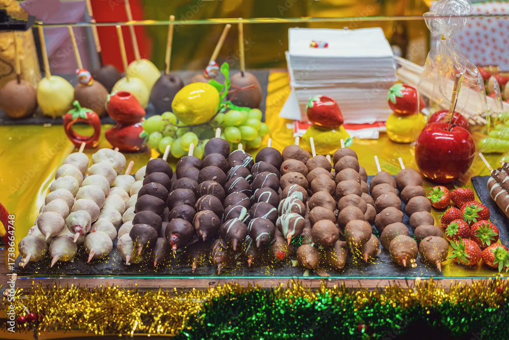 Colorful assortment of chocolate covered fruits on sticks displayed at Christmas festive market. Concept of sweet gifts, chocolate treat, fruit indulgence