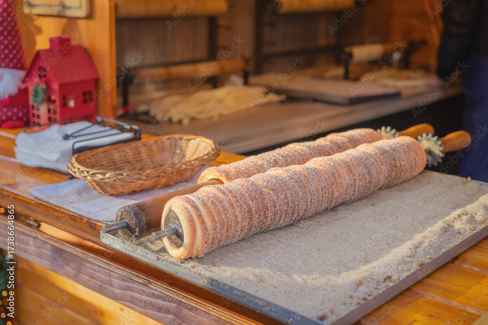 Traditional East Europe Christmas sugar dessert chimney cake, trdlo or trdelnik, sweet aromatic winter seasonal street food with cinnamon and spices