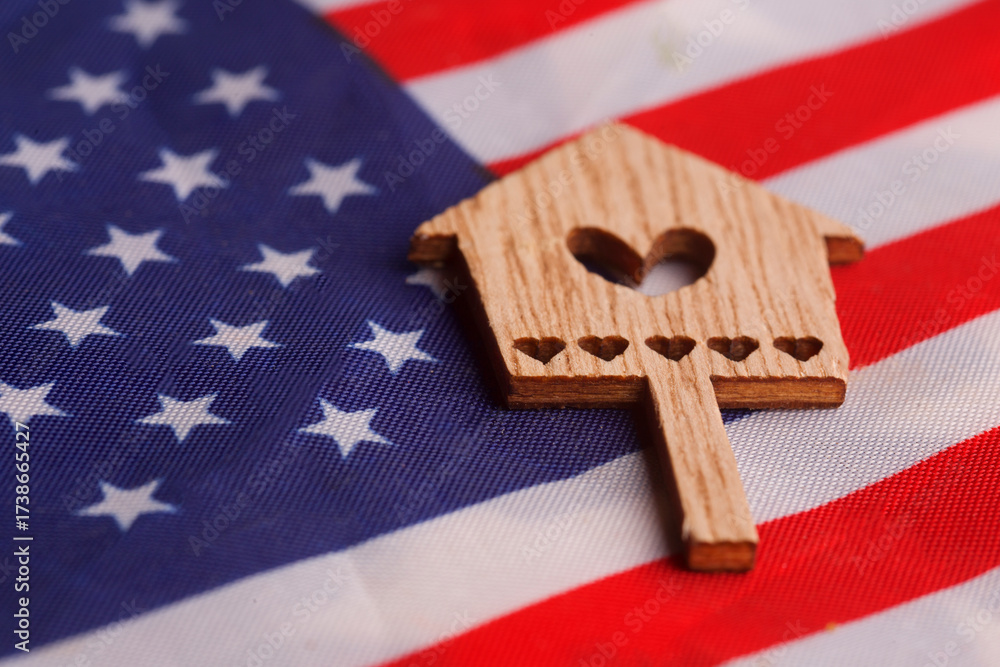 A wooden house against the backdrop of the US flag. Concept of the US House of Nations.