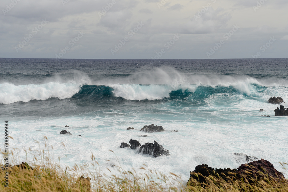 Waves crash on rugged rocks on serene Easter Island coast under clouds