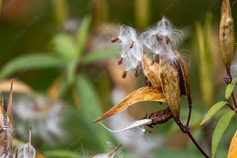 Macro abstract texture view of ripened swamp milkweed (asclepias incarnata) pods bursting with flossed seeds