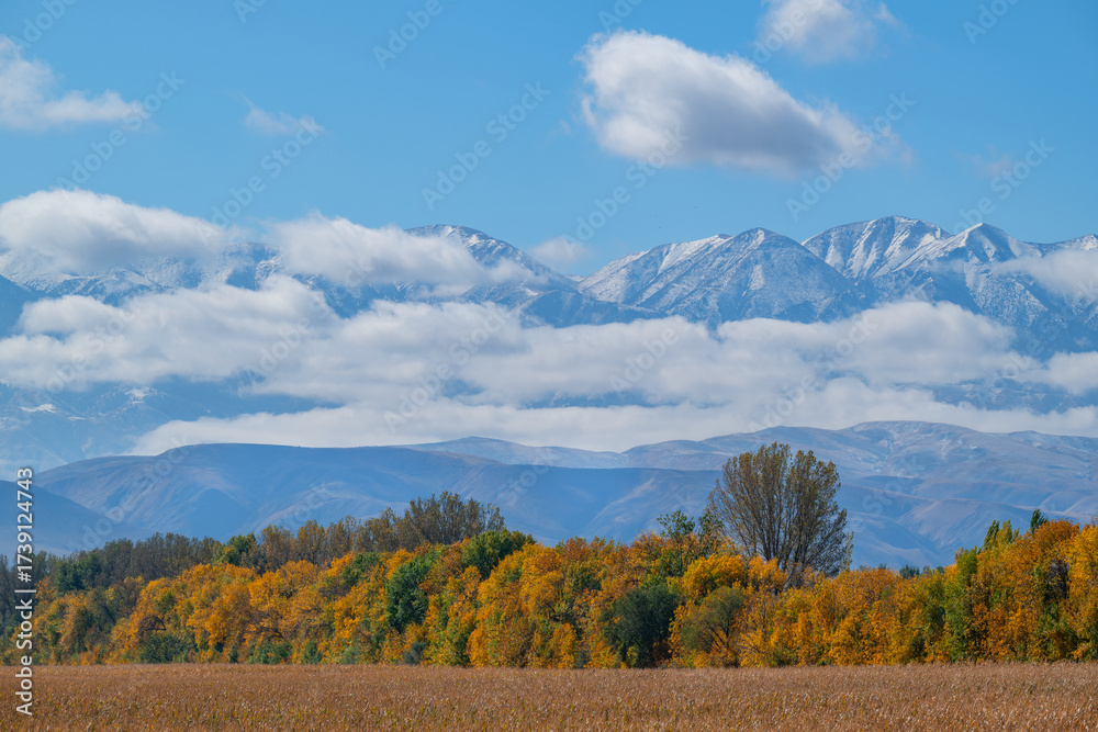 Picturesque view of a row of trees with yellow foliage against a backdrop of snow-capped mountain range with clouds on an autumn morning