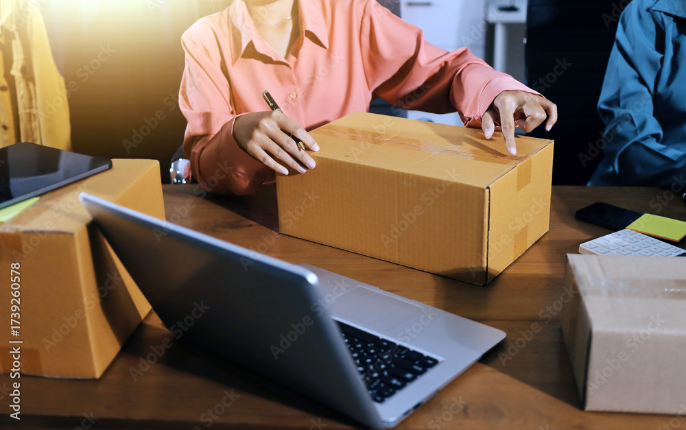Startup SME small business entrepreneur of freelance Asian woman wearing apron using laptop and box to receive and review orders online to prepare to pack sell to customers, online sme business ideas.