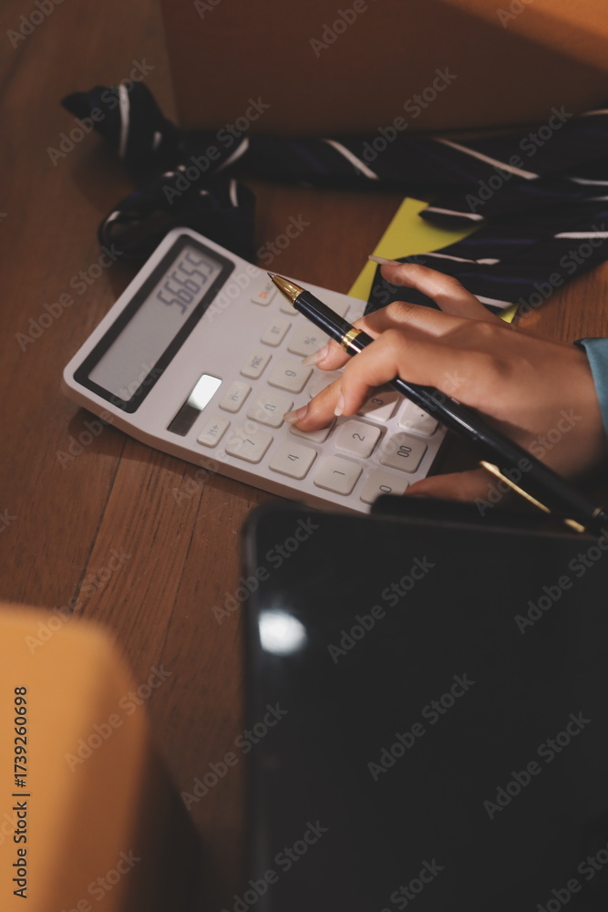 Startup SME small business entrepreneur of freelance Asian woman wearing apron using laptop and box to receive and review orders online to prepare to pack sell to customers, online sme business ideas.