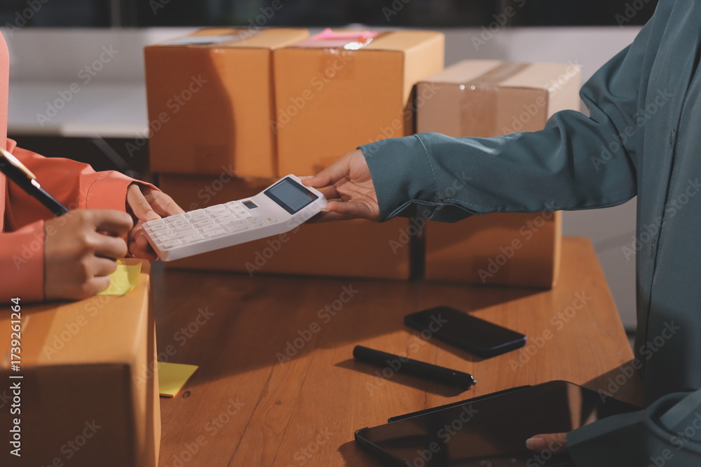 Startup SME small business entrepreneur of freelance Asian woman wearing apron using laptop and box to receive and review orders online to prepare to pack sell to customers, online sme business ideas.