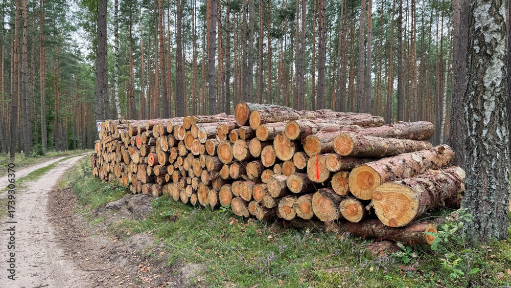 Stacked logs beside a dirt path in a dense forest. Tall trees surround the area, showcasing a natural woodland environment