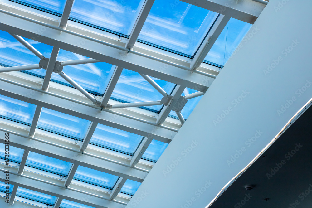 I see a clear blue sky through a beautiful skylight
