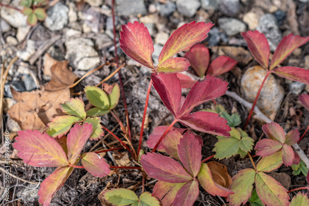 Fragaria virginiana, Virginia strawberry, wild strawberry, common strawberry, or mountain strawberry. U.S. Route 14 or U.S. Highway 14 (US 14). Yellowstone National Park, Wyoming