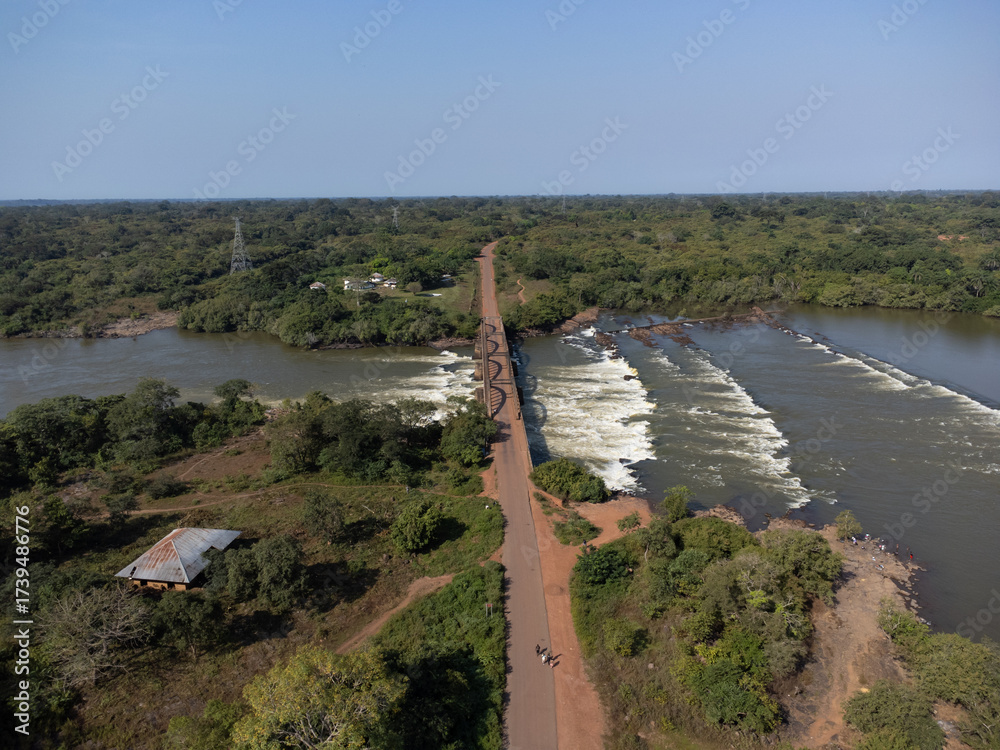 Scenic view of a bridge crossing a river with small waterfalls and lush forest