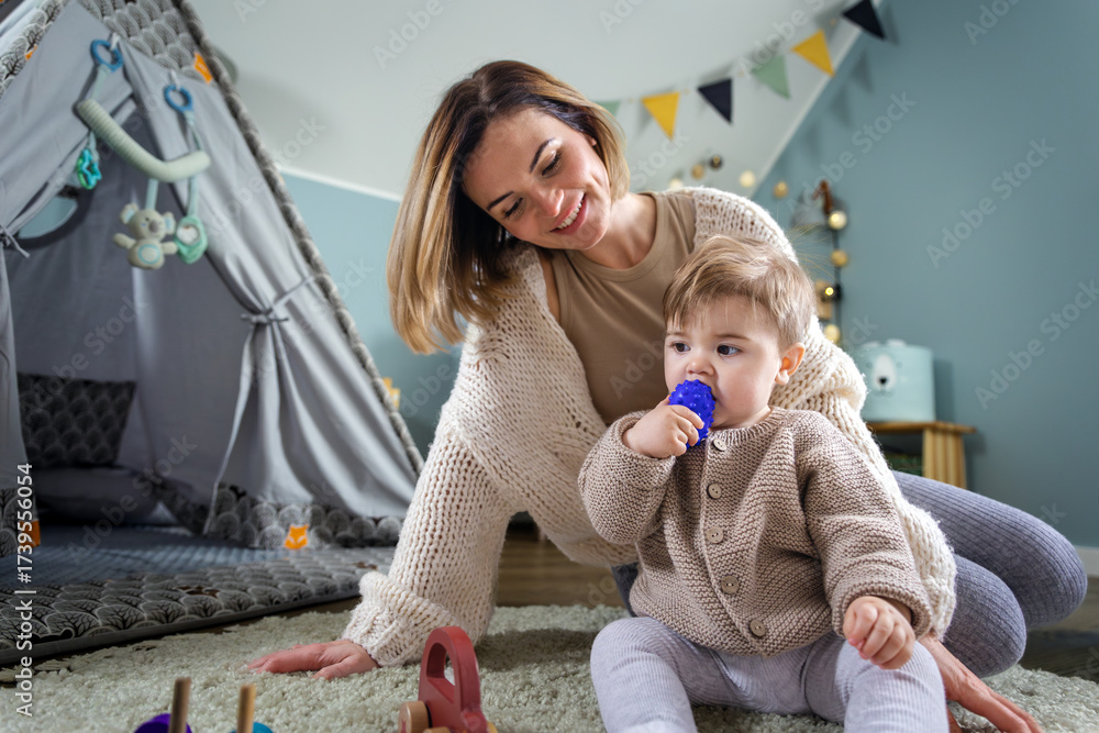 Mother and child playing together with children's toys in the children's room