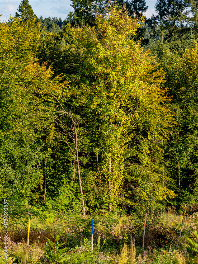 Wiederaufforstung im herbstlichen Mischwald