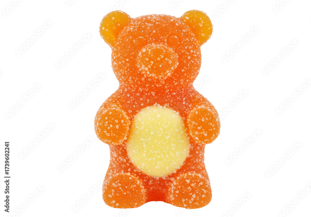 Orange gummy bear candy isolated PNG, sweet treat for kids and adults on transparent background, confectionery dessert