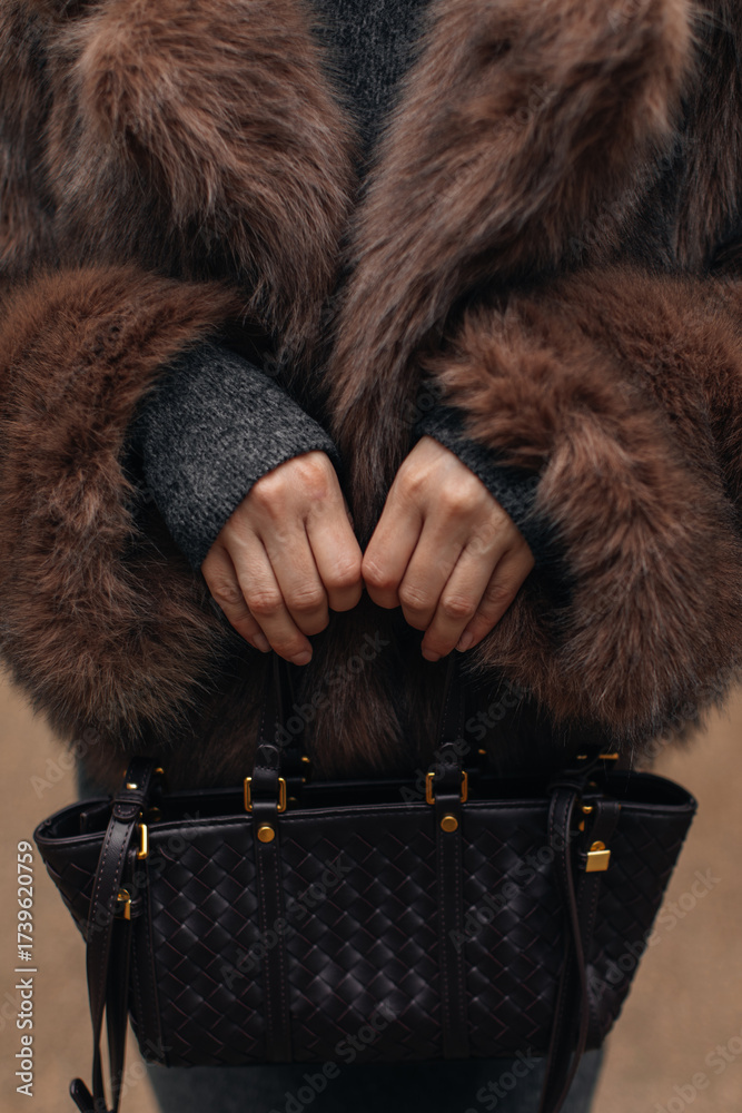 Stylish autumn winter fashion outfit of brown fur coat and woven leather handbag, women's casual style cloth