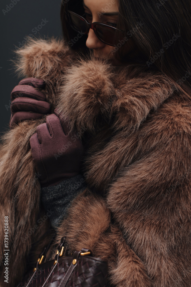Stylish autumn winter fashion outfit of brown fur coat, velvet gloves and woven leather handbag, women's casual style cloth