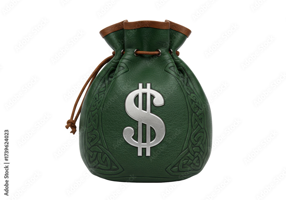 Isolated emerald money bag with drawstring closure for treasure or gold coins isolated