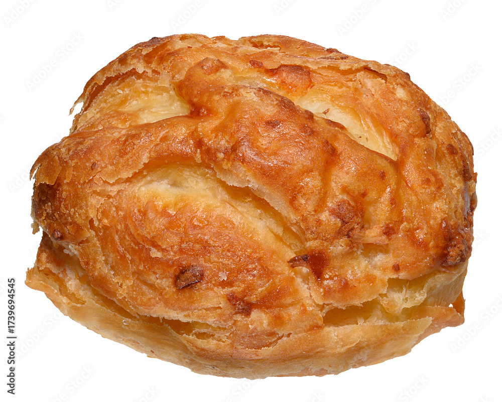 A golden brown puff pastry pastry with a textured texture, a bun on an isolated background