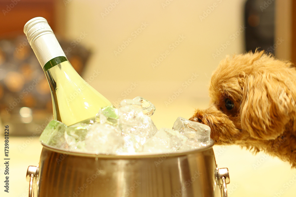 ワインクーラー入ったワインに興味があるトイ・プードル