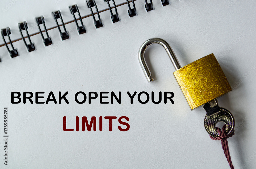 BREAK OPEN YOUR LIMITS, Motivational notepad with yellow padlock and key symbolizing breaking barriers and overcoming limitations.