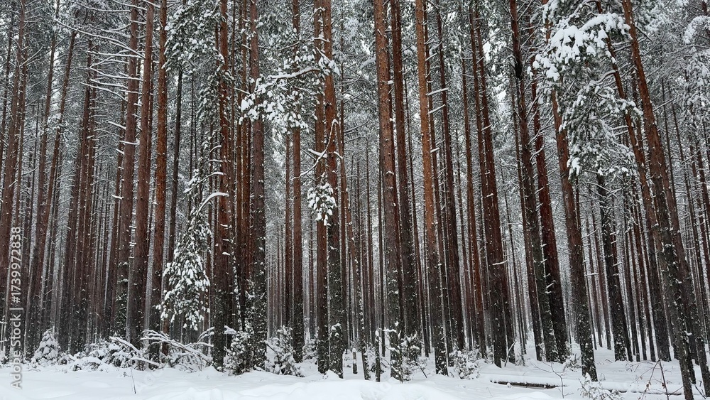 A picturesque snowy pine forest in winter, as a small snowball drops.