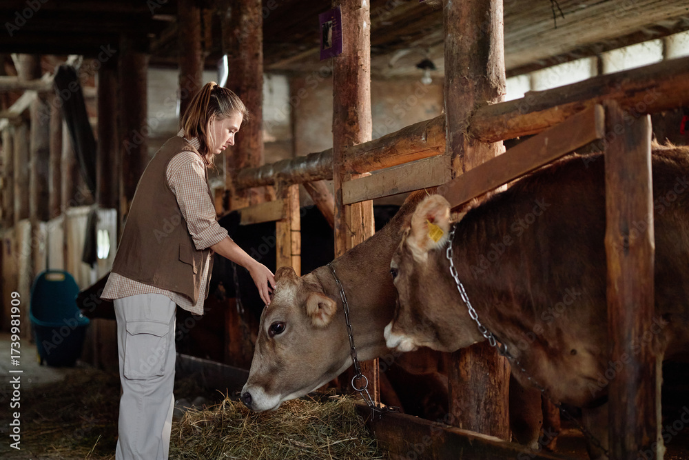 Caucasian young adult woman feeding and petting brown cows inside barn, standing near wooden stalls, showing interaction with livestock in agricultural setting, animals eating hay