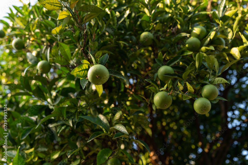 Close-up of unripe green oranges growing on a citrus tree in warm sunlight. Lush green foliage and natural summer garden atmosphere