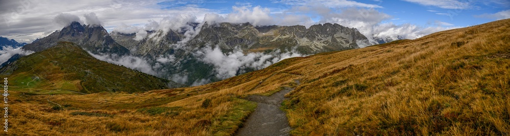 High resolution color panoramic image of the beautiful French Alps at Col De La Balme during a cold, wet, cloudy and foggy day. Part of the famous and beautiful TMB- Tour du Mont Blanc trail