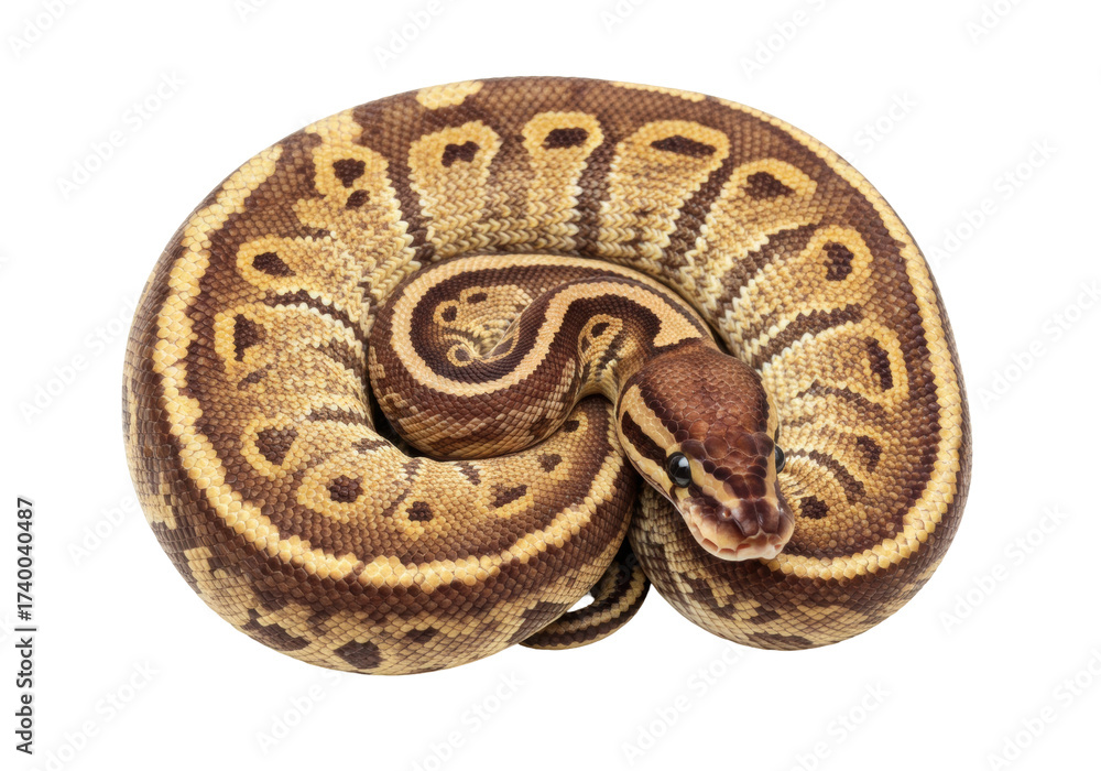 Isolated beautiful pastel ball python with a pattern skin rolled into a coil ring shape