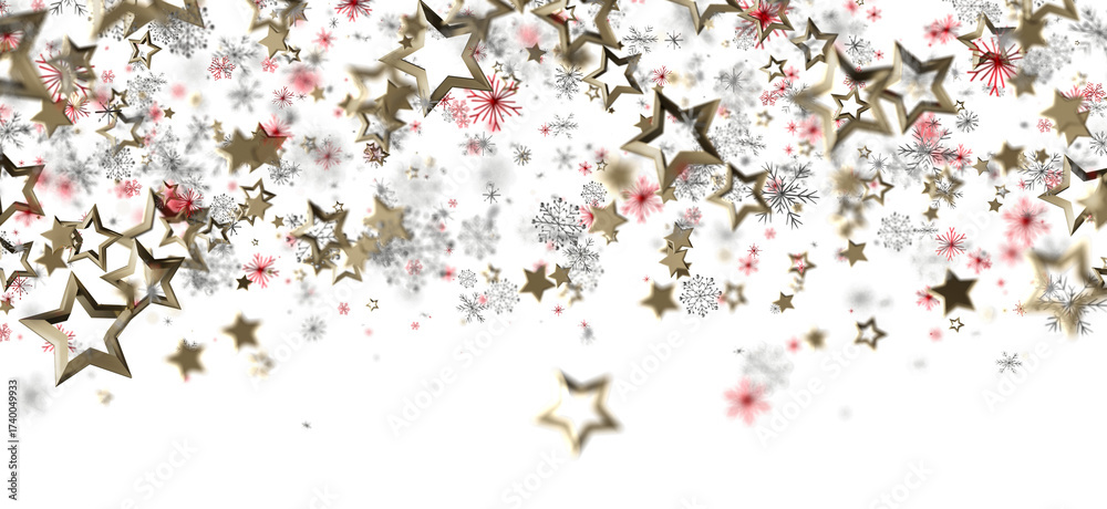 Festive image of golden stars, snowflakes and red flowers on white backdrop. Ideal for Christmas, holiday greetings, winter celebrations, and se