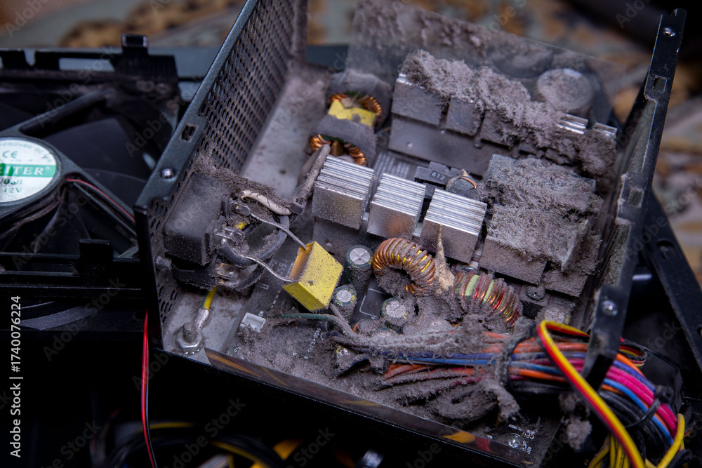 Dust accumulation inside an old computer power supply unit showing electronic components and wires in a cluttered workspace