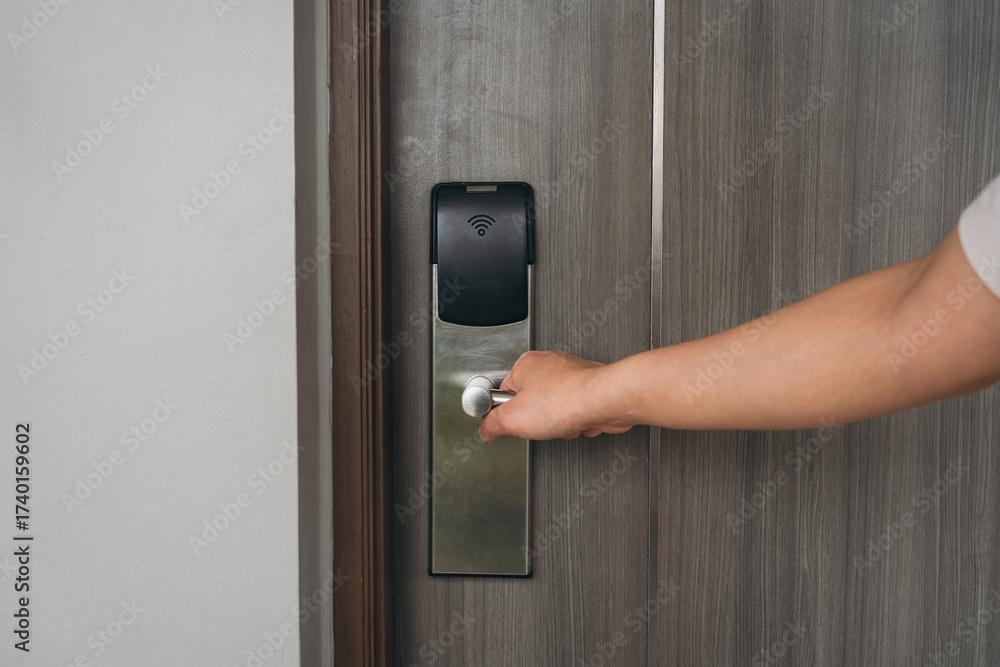 Electronic card key for open door in hotel. Smart card key to lock and unlock door. Security systems and protection concept.
