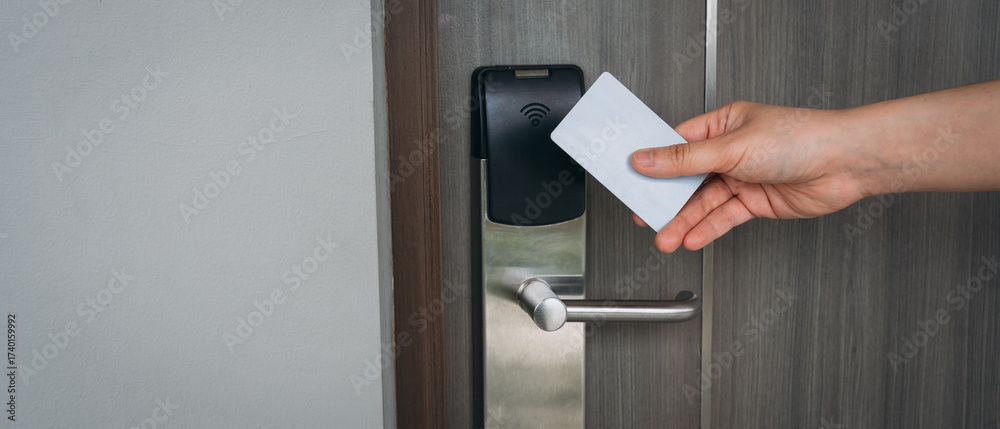Electronic card key for open door in hotel. Smart card key to lock and unlock door. Security systems and protection concept.