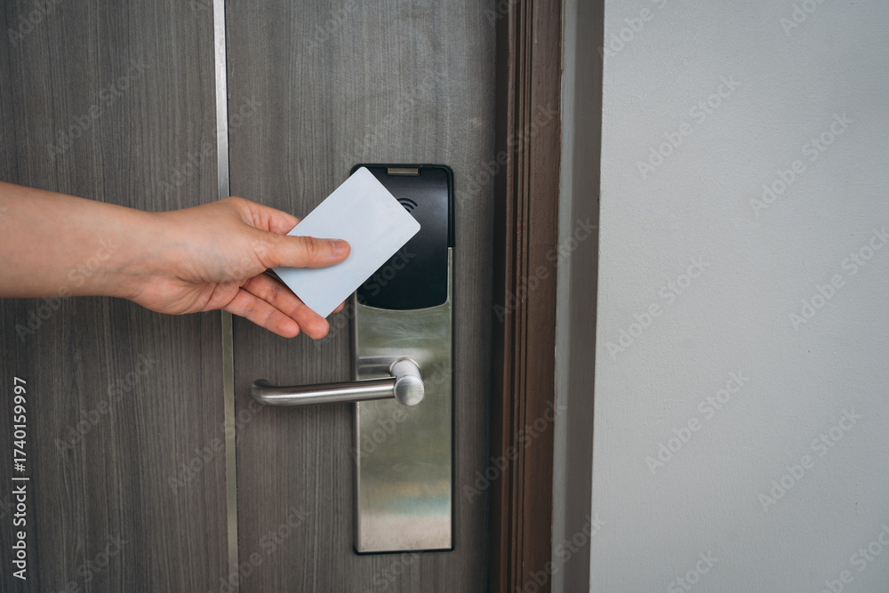 Electronic card key for open door in hotel. Smart card key to lock and unlock door. Security systems and protection concept.