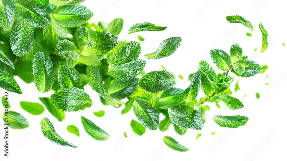 Stream of juicy bright mint leaves isolated on a transparent background.