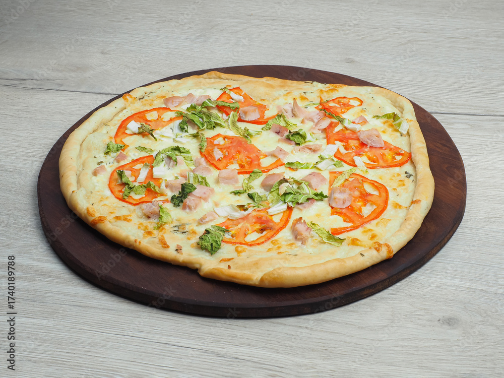 A full pizza against a light background, at a 45-degree angle.