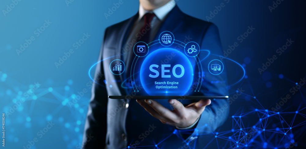 Businessman holding tablet with Search Engine Optimization SEO icons on screen - Digital Marketing Concept