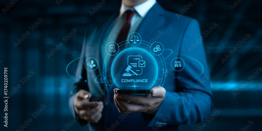 Businessman holding smartphone with compliance icons on screen - business and regulations concept