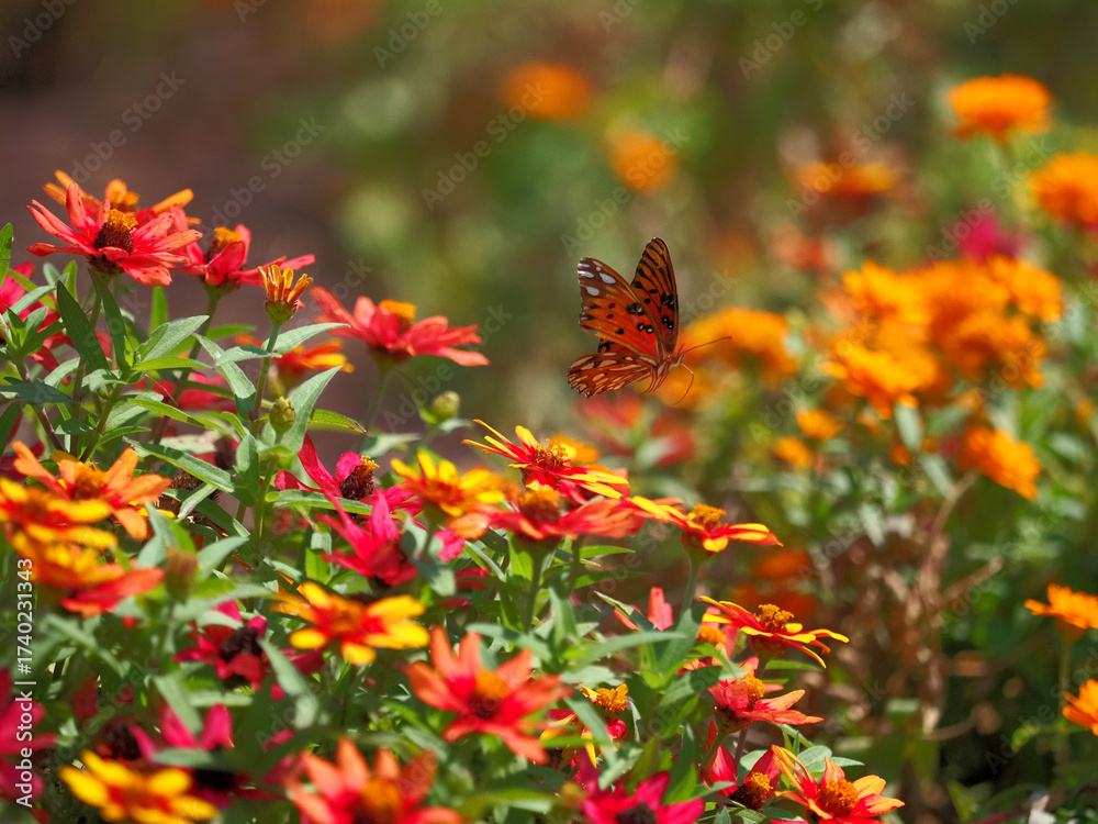 Gulf fritillary orange and black butterfly pollenating among beautiful autumn-colored flowers.