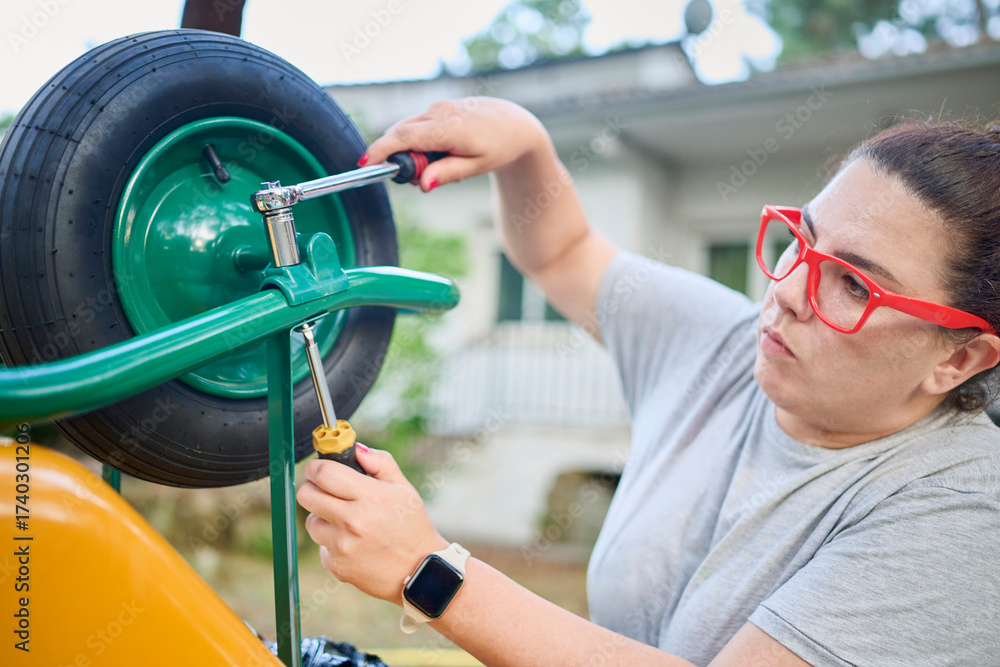 Young woman with glasses uses a ratchet tool and a screwdriver to tighten the wheel of a gardener wheelbarrow she is assembling in her garden