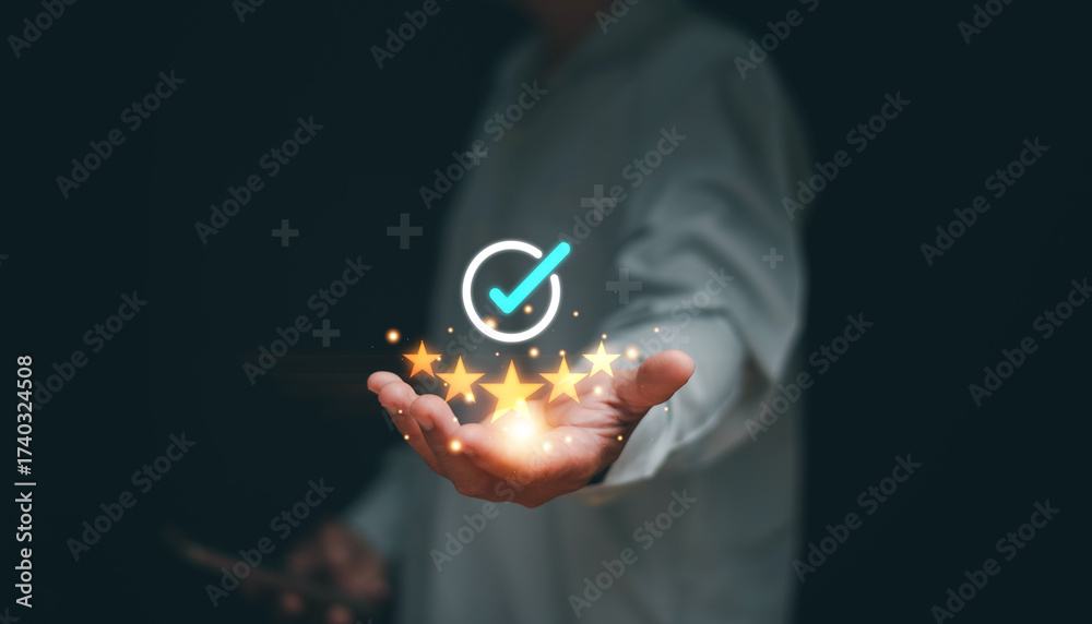 Customer satisfaction concept. Client's hand holding glowing five stars with a checkmark icon above. Symbolizing service quality, trust, positive experience and successful brand reputation.