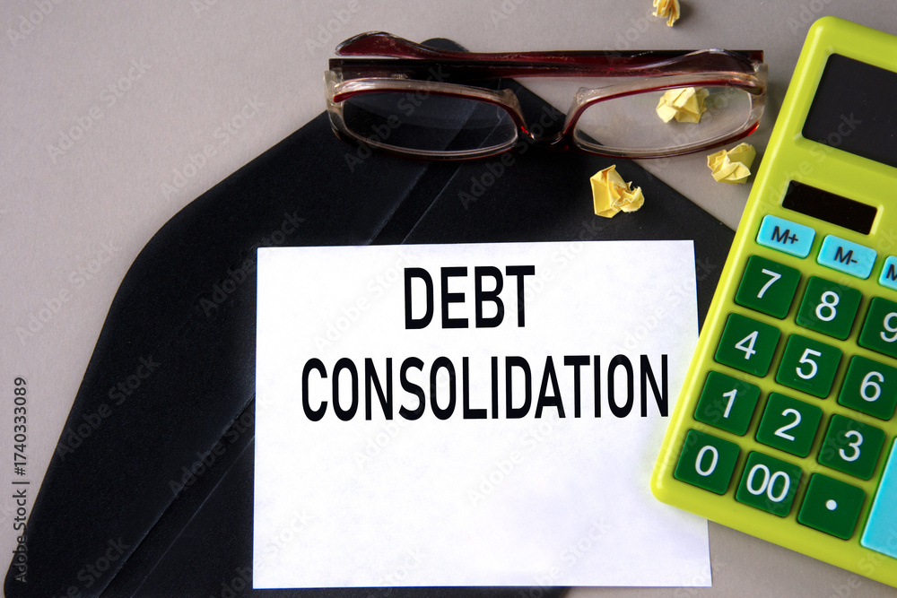 DEBT CONSOLIDATION - words on a white sheet on a black envelope with a calculator and glasses