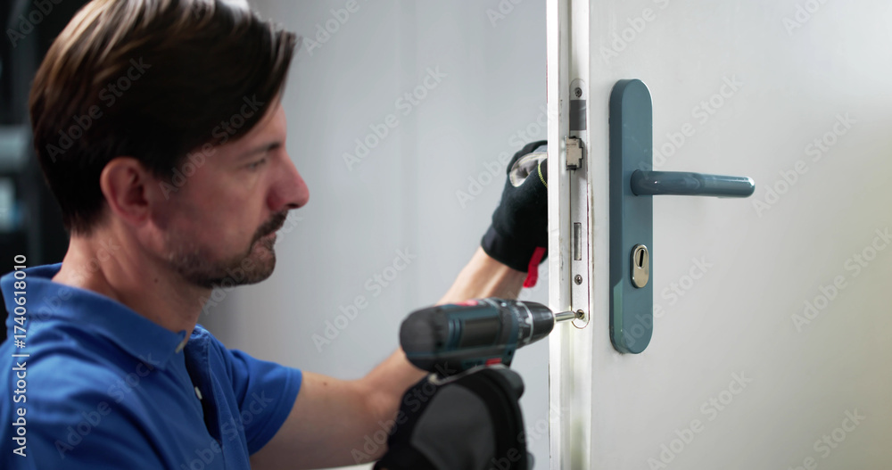 Skilled Locksmith Carefully Installing New Lock On Customer's Front Door